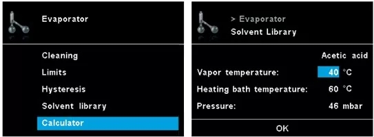 1)調(diào)用溶劑數(shù)據(jù)庫(kù),里面有內(nèi)置好的蒸餾參數(shù)—某種溶劑在特定加熱鍋溫度下所對(duì)應(yīng)的真空值,直接蒸餾