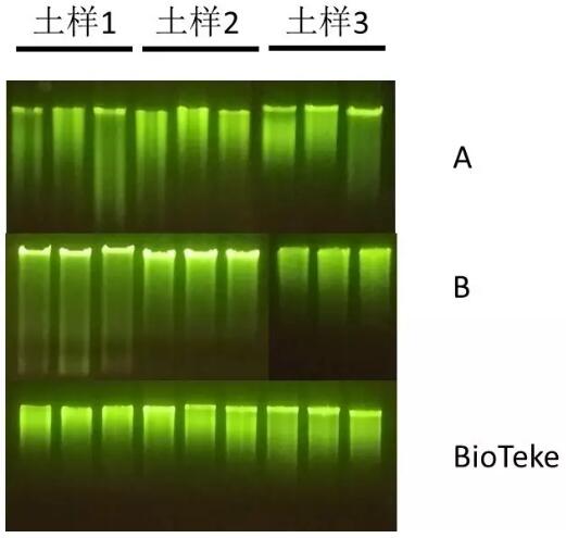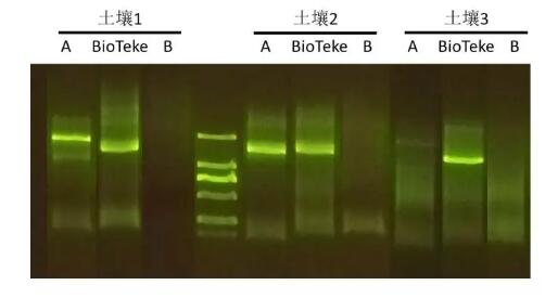 總結(jié):百泰克土壤提取試劑盒提取的土壤DNA,鹽殘留低,純度高,提取核酸中PCR抑制因子極低(A公司三種土壤有提取的核酸只有兩種滿足PCR條件;B公司提取的DNA鹽度尚可,但是含有的PCR干擾因子較多,PCR擴(kuò)增不出條帶。Bioteke土壤提取試劑盒可以正常擴(kuò)增,條帶單一且清晰)