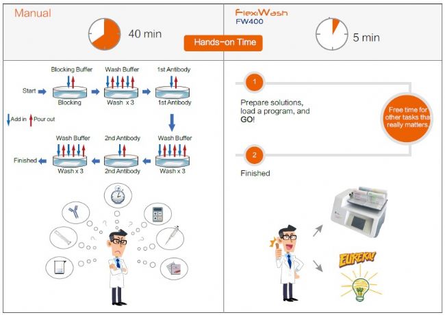那有沒有什么辦法讓這些煩人的操作統(tǒng)統(tǒng)自動完成?現(xiàn)在真的有一套設備能讓科學家躺著完成Western Blot——FlexiWash FW400自動化免疫雜交系統(tǒng),實現(xiàn)了對繁瑣耗時的Western Blot膜的孵育和洗滌過程的自動化和標準化過程。在蛋白被轉移到雜交膜上之后,可將雜交膜裝載到FlexiWash FW400工作站中進行自動封閉、孵育和洗滌循環(huán)。實驗人員僅需要準備相應體積的試劑,啟動免疫雜交流程,即可讓FlexiWash FW400完成剩下所有的工作。FlexiWash FW400支持4批樣品的同時孵育/洗滌,每個樣品可獨立進行編程,互不干擾。