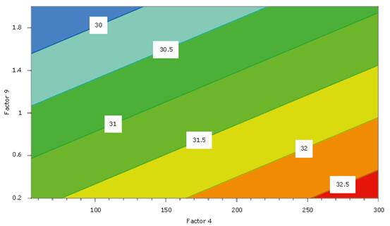 圖2 關(guān)鍵組分濃度優(yōu)化。等高線圖顯示出11種關(guān)鍵組分中的兩種(組分4,9)對蛋白產(chǎn)量的影響