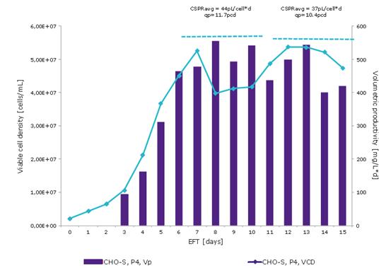 圖3 氨基酸濃度調(diào)整后的效果,在測試CHO-S細(xì)胞株上,CSPR從60 pL/cell/day降低到37 pL/cell/day,同時(shí)qp從原來的最高8.4pcd提高到最高11.7pcd。