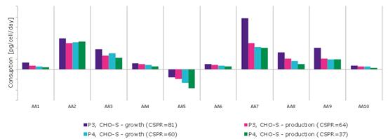 接著對調(diào)整后原型的氨基酸消耗速率進(jìn)行重新測試發(fā)現(xiàn):隨著CSPR的降低,細(xì)胞的氨基酸消耗速率也較之前發(fā)生了變化,降低CSPR,某些氨基酸卻出現(xiàn)了過量現(xiàn)象(見下圖4)。