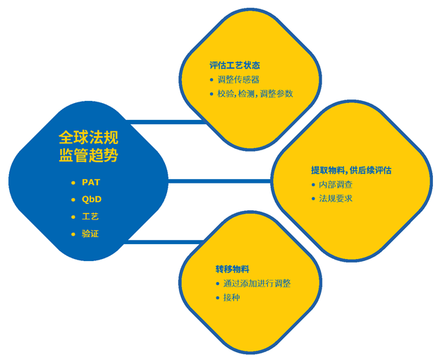 生物制藥生產(chǎn)過程中,不論是中間體還是最終產(chǎn)品的取樣對于生產(chǎn)至關(guān)重要。 除了通過生物負(fù)荷監(jiān)測確;颊甙踩,還需要進(jìn)行取樣以支持由全球監(jiān)管趨勢驅(qū)動的幾個關(guān)鍵必要事項(xiàng),包括過程分析技術(shù)(PAT)和設(shè)計(jì)源于質(zhì)量(QbD)(圖1)。