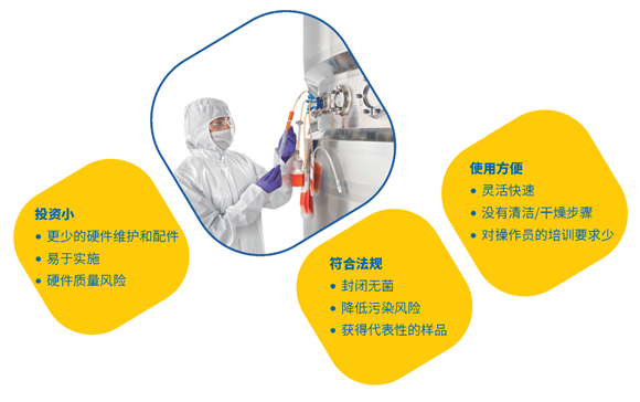 如圖2所示,與傳統(tǒng)方法相比,封閉的無菌過程采樣具有多個優(yōu)點(diǎn),包括易用性,更好地符合法規(guī)要求和有限的投資。