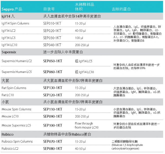體液樣本在biomarker的發(fā)現(xiàn)中有重要意義,雖然目前還沒有通過質(zhì)譜篩選或鑒定的方法發(fā)現(xiàn)的biomarker,但科學(xué)家們正在嘗試改良低豐度蛋白的富集和鑒定效率。這就需要我們能高效地去除體液樣本中的高豐度蛋白,如Albumin,IgG,transferrin等。相比市面上只能去除2種、12種的高豐度蛋白試劑,Seppro系列可去除多達(dá)50多種的中高豐度蛋白,富集到占總蛋白1%的低豐度蛋白。除了人類體液樣本Seppro® 還有試劑盒用于小鼠和大鼠樣品的處理,以及從植物樣品中去除二磷酸核酮糖羧化酶。