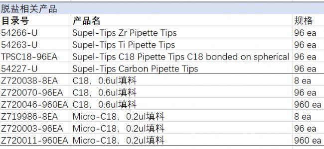 質(zhì)譜儀一般懼怕樣品中含鹽,所以對肽段脫鹽非常有必要,但樣本珍貴,需要保證高回收率且快速高效進(jìn)行分析物的吸附/洗脫,且后續(xù)能直接用與質(zhì)譜、HPLC、毛細(xì)電泳分析。如以下Supel-Tips和ZipTip系列。