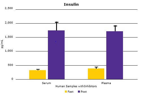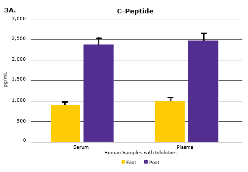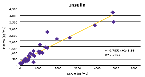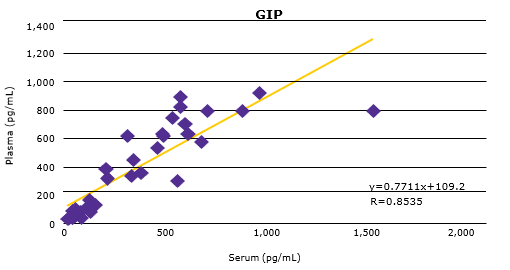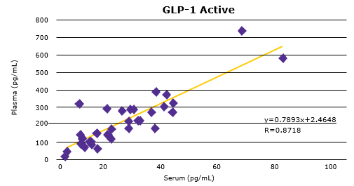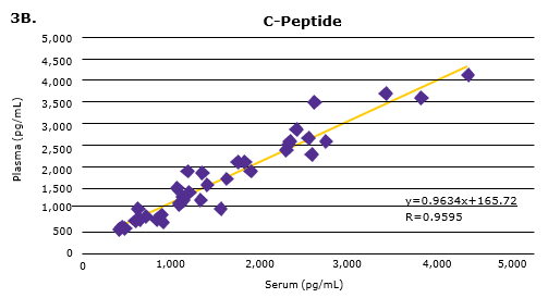 正如之前的預(yù)期,多種代謝激素水平會隨著食物的攝入而發(fā)生變化(血清中C-Peptide, GIP, active GLP-1與Insulin水平升高,如圖3A所示)。將匹配的人血清和血漿樣本進行比較,發(fā)現(xiàn)大多數(shù)分析物的血清和血漿樣本濃度非常接近(數(shù)據(jù)如圖3B所示)。