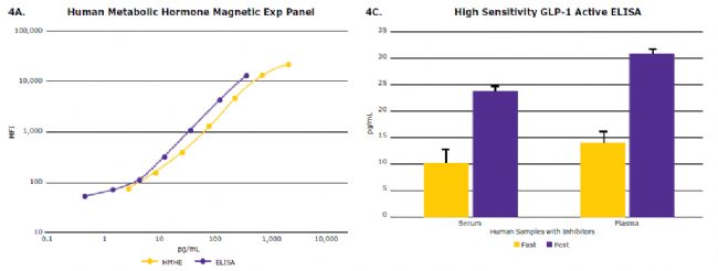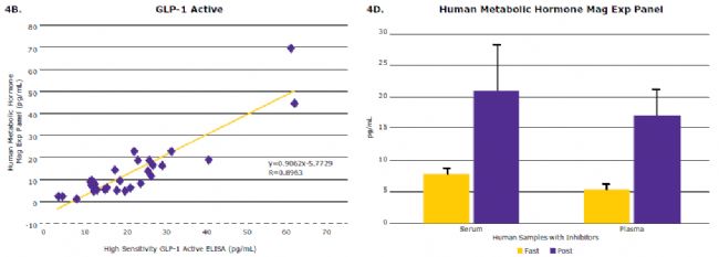▲圖4:MILLIPLEX® GLP-1(活性)檢測結(jié)果與GLP-1(活性)ELISA檢測結(jié)果(4A)的相關(guān)性,血清樣本(4B)和空腹與餐后受試者的比較(4C和4D)
