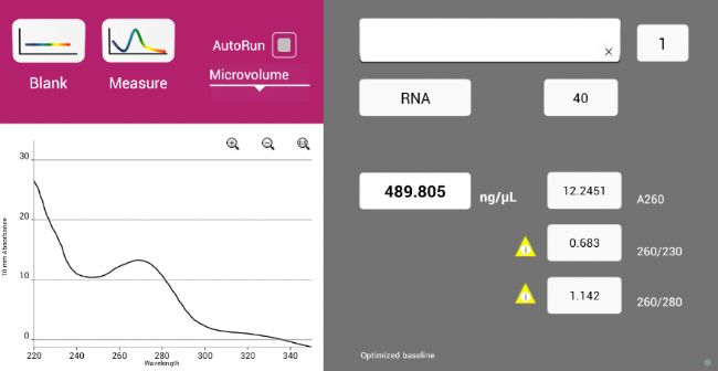 下圖為RNA紫外法檢測示意圖,A260/280和A260/230都不在正常的比值范圍,說明RNA樣品純度很差,儀器會自動進行提示,兩個黃色小三角就是警示圖標哦,點擊萌萌的黃色三角警示,儀器會顯示污染物的種類,夠智能吧,這就是DS-11特有的SmartQC功能