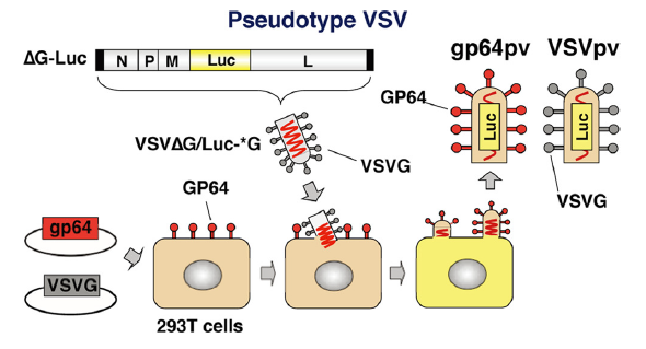 科研人員使用假病毒模擬抗體阻斷病毒進(jìn)入細(xì)胞的生物過程,檢測抗體或血清對假病毒是否具有中和活性 (假病毒通常經(jīng)過改造以攜帶熒光素酶報告基因,使其進(jìn)行定量分析時比對野生型病毒容易得多,而且已證明假病毒感染的細(xì)胞數(shù)量與報告基因表達(dá)成正比)。圖5:假病毒包裝過程 - 將熒光素酶和gp64基因插入VSV的全長cDNA克隆中(代替G基因命名為ΔG-Luc)。gp64pv和VSVpv是通過將VSVΔG / Luc-* G分別瞬時感染表達(dá)GP64和VSVG的293T細(xì)胞而產(chǎn)生的。
