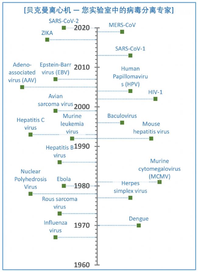 自1947年第一臺商用超速離心機(jī)發(fā)明以來,貝克曼庫爾特離心技術(shù)已有70多年的發(fā)展歷史。早在19世紀(jì)60年代,已有科學(xué)家使用貝克曼離心機(jī)成功分離了多種病毒顆粒。到今天,貝克曼超速離心技術(shù)已助力科學(xué)家們分離得到冠狀病毒、流感病毒、肝炎病毒、腺病毒、慢病毒等幾乎所有類型的病毒種類。