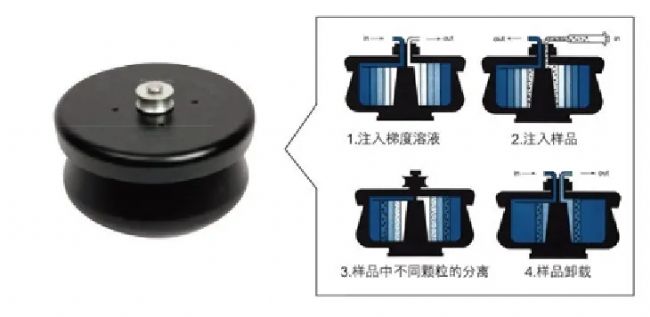 核心組件將轉(zhuǎn)頭缽體分為四個(gè)部分,當(dāng)轉(zhuǎn)頭在2,000 RPM 運(yùn)行時(shí),通過(guò)一個(gè)可拆卸的密封加樣組件將梯度液泵入轉(zhuǎn)頭,密度較低的梯度液先注入,順次泵入密度較高的梯度液,在離心力的作用下,依次形成不同的梯度液層。然后加入樣品,完成設(shè)定轉(zhuǎn)速的離心