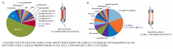 體液樣本在biomarker的發(fā)現(xiàn)中有重要意義,雖然目前還沒有通過質(zhì)譜篩選或鑒定的方法發(fā)現(xiàn)的biomarker,但科學家們正在嘗試改良低豐度蛋白的富集和鑒定效率。這就需要我們能高效地去除體液樣本中的高豐度蛋白,如Albumin,IgG,transferrin等。相比市面上只能去除2種、12種的高豐度蛋白試劑,Seppro系列可去除多達50多種的中高豐度蛋白,富集到占總蛋白1%的低豐度蛋白。除了