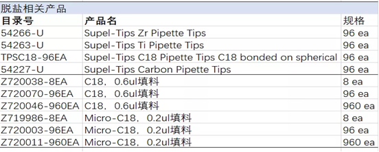 質(zhì)譜儀一般懼怕樣品中含鹽,所以對肽段脫鹽非常有必要,但樣本珍貴,需要保證高回收率且快速高效進行分析物的吸附/洗脫,且后續(xù)能直接用與質(zhì)譜、HPLC、毛細電泳分析。如以下Supel-Tips和ZipTip系列。
