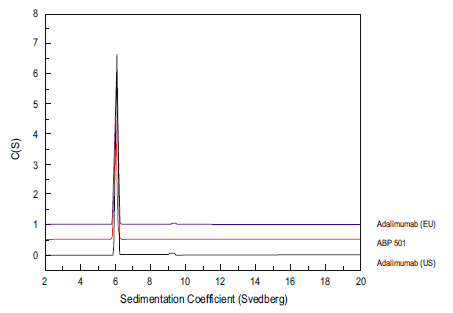 以阿達(dá)木單抗類似物為例,安進(jìn)公司研發(fā)的ABP501成為首個FDA批準(zhǔn)的Humira類似物。在其提交的上市申請中,使用分析型超速離心技術(shù)對阿達(dá)木單抗類似藥ABP501進(jìn)行了聚集體的定性和定量分析。同時檢測ABP501、美國市場Humira與歐洲市場Humira,根據(jù)AUC圖譜確定其相似性。另外,根據(jù)AUC數(shù)據(jù)結(jié)果,證明單體、聚體溶液中百分含量接近,從而確定類似藥與原研藥的一致性。