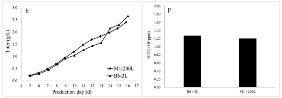 最終工藝被放大到200L的中試規(guī)模,并較好的重現(xiàn)了3L反應器中的結果: