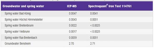 ®鐵測試盒和ICP-MS測試5種不同的樣品,所有的樣品都在對應方法的檢出限LOQ以下,(0.0007 mg/L for ICP-MS, 0.0025 mg/L for Spectroquant