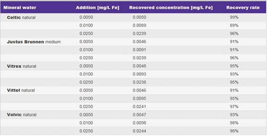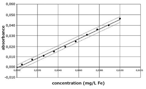 痕量級高靈敏度分析方法主要包括火焰原子吸收光譜法和電感耦合等離子體發(fā)射光譜法(ICP-OES)。根據(jù)相關(guān)標準中的限值,DIN EN ISO 404063中的火焰原子吸收光譜法的測量范圍為0.002–0.020 mg/L Fe。根據(jù)DIN EN ISO 11885中的ICP-OES方法的檢出限(LOQ)為0.002 mg/L Fe。使用ICP-MS方法,通常檢出限(LOQ)可達0.0007 mg/L Fe。