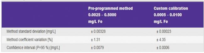 如果想達到更低的檢出限(LOQ)三嗪法可滿足需求, 在這個方法中,所有的鐵離子被轉(zhuǎn)化成二價鐵離子,在巰基乙酸酯的溶液中,二價鐵離子和鄰菲啰啉生成穩(wěn)定的紫紅色化合物,該物質(zhì)可以用光度法進行檢測。使用100 mm比色皿和Prove 600實驗室多參數(shù)水質(zhì)分析儀,檢出限(LOQ)可達到0.0025 mg/L。默克Spectroquant