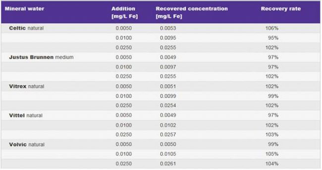 ®鐵測試盒 (Cat. No. 114761)的測試范圍:0.0025-5.00 mg/L Fe,這是一種簡單、快速、安全的分析測試方法,可作為ICP或AAS的替代方法,經(jīng)過大量的比對實驗,可應用于生活飲用水、包裝飲用水、地下水中的鐵離子的分析和檢測。