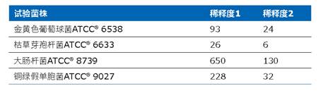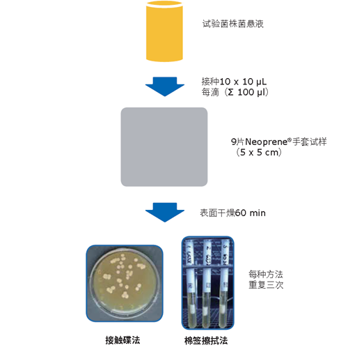 將Neoprene®手套試樣清潔并高壓滅菌。取4種試驗(yàn)微生物在兩種不同稀釋度的菌懸液,在試樣表面接種,使其均勻分布。表1列出了所選取的試驗(yàn)微生物以及接種在測試表面的菌落數(shù)CFU。革蘭氏陰性菌的接種量會(huì)更高一些,因?yàn)樗鼈儗?duì)接種表面材料的干燥過程更為敏感。