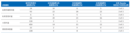 表2:ICR接觸碟在隔離器Neoprene®手套表面取樣的微生物菌落數(shù)CFU回收率及ICR Swabs取樣拭子呈陽性的樣品數(shù)量結(jié)果