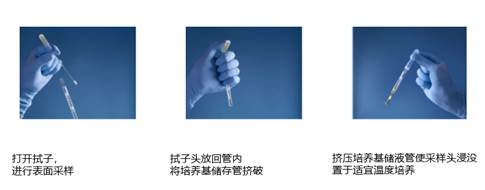 3)棉簽擦拭法:用已預(yù)濕潤的ICR Swabs取樣拭子頭在干燥表面上小心沿水平和垂直方向擦拭取樣。隨后將ICR Swabs頂部的TSB液體培養(yǎng)基擠進(jìn)拭子頭的試管中,由于干燥可能會(huì)延長微生物生長的遲緩期,所以將Swabs取樣拭子30–35°C培養(yǎng)長達(dá)七天,并每日目視檢查觀察試管的濁度情況。