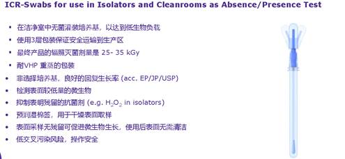 最后,按照法規(guī)的要求,A級(jí)區(qū)表面是不得檢出微生物的,ICR Swabs可對(duì)表面擦拭進(jìn)行陰陽性的檢查,可有效的解決拭子采樣回收率的問題,也很好的解決了由于操作步驟復(fù)雜所帶來的假陽性的污染風(fēng)險(xiǎn)。