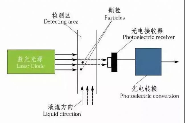 當(dāng)液體中的微粒通過一窄細(xì)檢測通道時(shí),與液體流向垂直的入射光,由于被微粒阻擋而減弱,因此由傳感器輸出的信號降低,這種信號變化與微粒的截面積大小相關(guān),從而得到微粒的大小和數(shù)量。