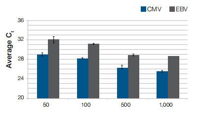 上圖.使用MagMAX病毒/病原體核酸提取試劑盒,在KingFisher Flex儀器上從400μl血漿中提取不同拷貝數(shù)的CMV和EBV核酸,在 Applied Biosystems™QuantStudio™ 12K Flex Real-Time PCR 系統(tǒng)上檢測(cè)獲得的平均Ct值。
