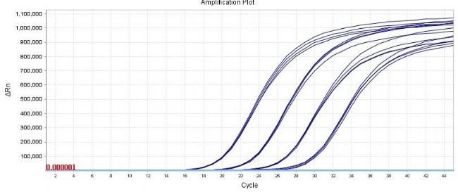 上圖.使用某國(guó)產(chǎn)核酸提取試劑盒,在KingFisher Flex儀器上從200μl樣本中提取不同拷貝數(shù)的新冠假病毒,病毒拷貝數(shù)從105到100 拷貝/mL,在Applied Biosystems™7500實(shí)時(shí)熒光定量PCR系統(tǒng)上進(jìn)行檢測(cè)得到的結(jié)果。