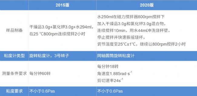 黃原膠通常認(rèn)為無毒、無刺激性,而且在低質(zhì)量濃度下就具有高粘度,而且能提供良好的觸變性,因此在口服和局部藥物制劑、化妝品以及食品中可用作助懸劑/穩(wěn)定劑/增稠劑等。由于黃原膠良好的物理性能以及在藥物制劑中的廣泛應(yīng)用,《中國藥典》自2010版始收載黃原膠,本次2020版藥典對黃原膠粘度測量使用的粘度計(jì)類型作出修訂,修訂變動(dòng)如下: