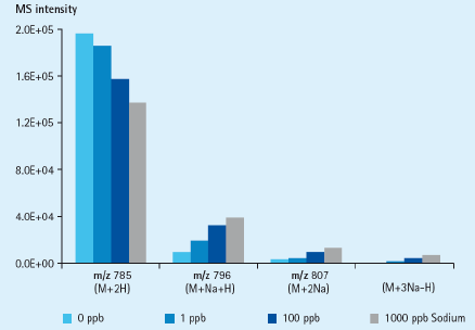圖 2 鈉離子的存在增加了加合物的形成并對信號產(chǎn)生抑制作用