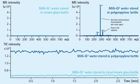 一些普遍存在的添加劑(抗靜電劑,穩(wěn)定劑和塑化劑),這些都會導(dǎo)致鬼峰,并提高背景噪音(圖 3)。建議使用表面特殊處理的棕色玻璃瓶或硼玻璃。標(biāo)準(zhǔn)玻璃瓶中,硅和堿金屬的釋放會形成加合物(請參考圖 2 中鈉離子的影響)。