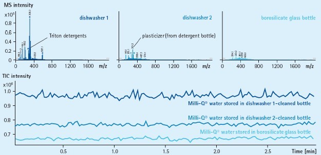 Milli-Q制備的超純水分別儲存在兩種不同品牌洗瓶機(jī)和LC-MS級別水/乙腈清洗后的玻璃瓶中后的MS譜圖及TIC譜圖