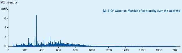 實(shí)驗(yàn)室環(huán)境中含有多種污染物(有機(jī)物質(zhì),堿金屬,細(xì)菌,塑料等),因此純水暴露在實(shí)驗(yàn)室環(huán)境中或者使用純水過程中有多種轉(zhuǎn)移步驟都會導(dǎo)致水質(zhì)下降。實(shí)踐證明,長期儲存純水會增加純水與實(shí)驗(yàn)室環(huán)境的接觸。這一結(jié)果會導(dǎo)致高 MS 背景噪音(圖 1),金屬加合物的產(chǎn)生和信號的抑制(圖 2)。
