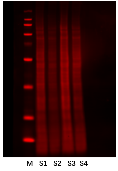 例:當(dāng)前有四份蛋白樣品S1、S2、S3、S4,需要檢測目的蛋白Test在這四份樣品中的相對表達(dá)量(本次實(shí)驗(yàn)中使用的非特異性熒光染料,可以對所有蛋白進(jìn)行染色;二抗為FITC熒光標(biāo)記)。