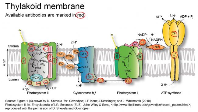 光系統(tǒng)I(PSI)是整合于光合膜上的由多個蛋白亞基組成的色素蛋白復(fù)合物,它在光合電子傳遞鏈中催化電子從類囊體膜內(nèi)的蛋白質(zhì)體藍素(PC)和細胞色素c6轉(zhuǎn)移到類囊體膜外的還原鐵氧還蛋白(Fd)或黃素氧還蛋白。PSI相對較多地分布于葉綠體類囊體膜基質(zhì)膜區(qū),目前已知,PSI由12(細菌)或13(高等植物)個蛋白亞基組成,根據(jù)他們的基因把這些亞基分別命名為PsaA到PsaX。在組成PSI的蛋白亞基中,PsaA和PsaB以異二聚體狀態(tài)結(jié)合做為反應(yīng)中心,里面包含電子原初供體P700和中心電子傳遞鏈A0、A1和FX。P700激發(fā)態(tài)的電子原初受體是A0,次級受體A1為2個葉醌分子,再將電子傳遞給一個含4Fe-4S中心的鐵硫蛋白(FeSx),最后電子供給含2Fe-2S中心的鐵氧還蛋白(Fd),最后在Fd-NADP還原酶(FNR)的催化下,將NADP+還原為NADPH。藍細菌、綠藻和高等植物的PSI復(fù)合物還包含3個外周蛋白PsaC、PsaD、PsaE以及5個膜內(nèi)周蛋白PsaL、PsaK、PsaF、PsaI、PsaJ。一般認為PsaD通過與帶有負電荷的Fd之間的靜電作用而為Fd提供必要的結(jié)合位點,同時,PsaD也是PsaC和PsaE正確組裝進PSI所必需的。PsaE是Fd還原所必需的,并可能參與PSI周圍的環(huán)式電子傳遞。PsaL是組成PSI的三聚體的一個亞基。PsaF暴露在基質(zhì)一側(cè)的亞基,能夠與Pc和Cytb6f關(guān)聯(lián)。PsaM存在于藍藻PSI中。其它亞基如PsaJ、PsaK、PsaI和PsaM都很小,這些亞基從細菌到高等植物都嚴格保留。