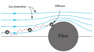 氣溶膠顆粒在氣體介質(zhì)中會不斷地做布朗運動,纖維材料有極大的概率收集偏離氣流中心的小顆粒。這一方式可以收集絕大多數(shù)的超細顆粒物質(zhì),且分散性最好。