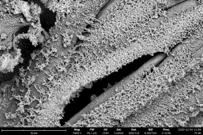 當氣流流速較快時,一部分質(zhì)量較大的顆;驁F聚體具備較大的動量。在于纖維接觸后,因為慣性的原因,大顆粒會來不及改變運動方向,從而被纖維攔截。而當沉積的時間足夠久,通過沖壓沉積形成的顆粒會結(jié)合成類似于蜘蛛網(wǎng)的結(jié)構(gòu),并且將孤立的纖維連接在一起。這種蜘蛛網(wǎng)結(jié)構(gòu)保留了較多的氣孔,從而有利于氣體的擴散并暴露纖維本身的活性位點。