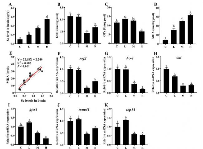 相比于對照組(C),中(M:12.16 μg Se/g 干重)和高(H:34.61 μg Se/g 干重)濃度處理組斑馬魚腦組織中總硒累積量升高(圖1A),ROS水平增加,抗氧化酶活性以及相關硒蛋白基因表達量降低(圖1B-K),證明Se-Met導致斑馬魚腦組織抗氧化能力降低。