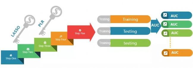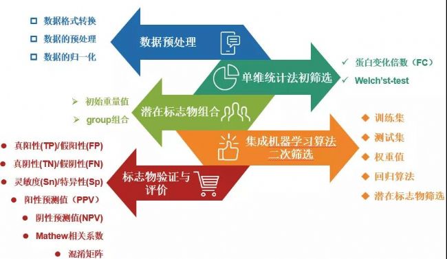 整套機器學(xué)習(xí)算法體系分為5個階段:數(shù)據(jù)預(yù)處理、初篩選、潛在標志物組合、機器學(xué)習(xí)算法二次篩選、標志物驗證與評價,如下圖所示: