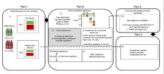 Oral squamous cell carcinoma-口腔鱗狀細胞癌(OSCC)是頭頸部最常見的惡性腫瘤,其不同區(qū)域具有特殊的組織病理學(xué)和分子特征因而限制了標準的腫瘤淋巴結(jié)轉(zhuǎn)移預(yù)后分類。因此,作者將無淋巴結(jié)轉(zhuǎn)移組(NO,n=14)與由淋巴結(jié)轉(zhuǎn)移組(N+,n=26)的唾液樣本進行蛋白組檢測,并開發(fā)一種用于測量肽和蛋白質(zhì)的預(yù)測能力的機器學(xué)習(xí)的工作流程,應(yīng)用機器學(xué)習(xí)策略,評估了多肽和蛋白質(zhì)的預(yù)測能力,篩選區(qū)分淋巴結(jié)轉(zhuǎn)移OSCC患者(N+)和無淋巴結(jié)轉(zhuǎn)移OSCC患者的預(yù)后標志物。
