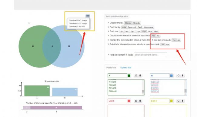 第三步:(釋義與數(shù)據(jù)導(dǎo)出)在上圖紅框中輸入數(shù)據(jù),即可得到兩個數(shù)據(jù)集的交集基因,如不需要柱狀圖,可通過將下圖紅框中設(shè)置為"NO",同時通過點擊黃框中的英文即可得到圖像及相應(yīng)的文件。
