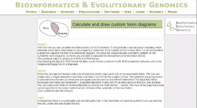 jvenn和Draw Venn Diagram兩個Venn圖網(wǎng)站各有優(yōu)缺點。jvenn只能畫少于6組的Venn圖且會限制組名的長度,Draw Venn Diagram能夠畫大于6組的圖像。