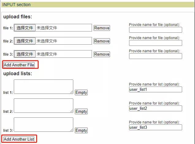 第二步:(數(shù)據(jù)輸入)左側(cè)輸入數(shù)據(jù),這里既可以導(dǎo)入文件,也可以直接輸入組合的列表,如果輸入框不夠,可以點擊"Add"添加新的輸入框。右側(cè)可填寫對應(yīng)組合的名稱。