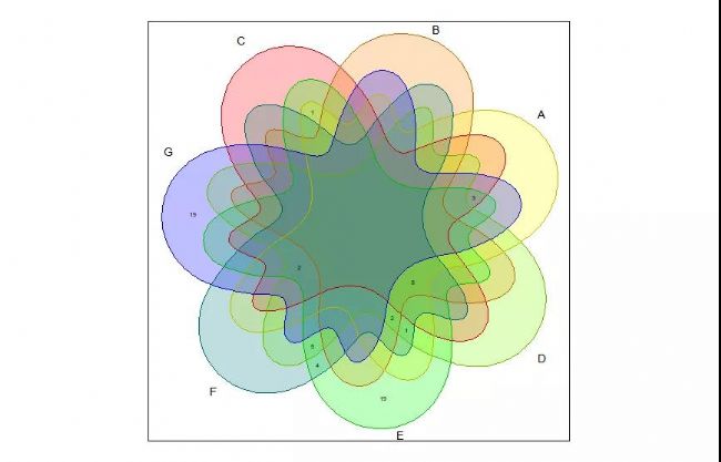 (2)面對多于5個樣本的數(shù)據(jù),大家可以使用叫"venn"的R包,它最多可支持7個樣本的韋恩圖。