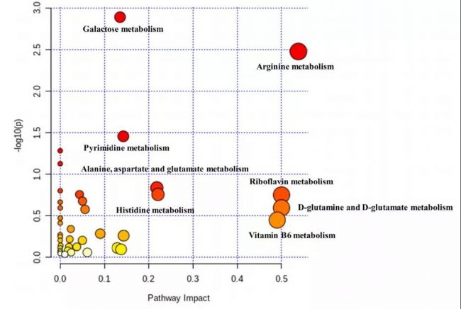 在本研究中,富集分析中p<0.05或拓?fù)浞治鲋杏绊懼荡笥?.2的途徑被認(rèn)為是T2DM的關(guān)鍵因素。共選擇了精氨酸生物合成、半乳糖代謝、嘧啶代謝、丙氨酸、天冬氨酸和谷氨酸代謝、組氨酸代謝、d-谷氨酰胺和d-谷氨酸代謝、核黃素代謝和維生素B6代謝等8種途徑作為差異通路。這8種途徑涉及19種代謝物。與對照組相比,包括蔗糖、棉子糖、半乳糖醇、d-葡萄糖、半乳肌醇、肌醇、l-谷氨酸、精氨酸琥珀酸、l-天冬酰胺、二氫尿嘧啶、乳清酸、胸腺嘧啶、胞苷5′-單磷酸鹽(CMP),和核黃素在T2DM患者血清中顯著上調(diào)。而其他(即l-精氨酸、l-組氨酸、瓜氨酸、維生素B6和脫氧胞苷) 在T2DM患者血清中顯著下調(diào)。