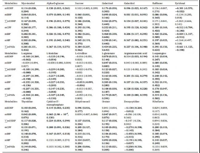 表1.差異代謝物響應(yīng)值與尿中mPAEs含量在線性回歸模型中的回歸系數(shù)