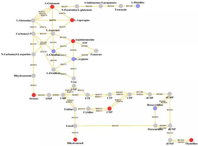 進(jìn)一步繪制了與氨基酸代謝和嘧啶代謝相關(guān)的代謝生物標(biāo)志物變化的網(wǎng)絡(luò)圖。